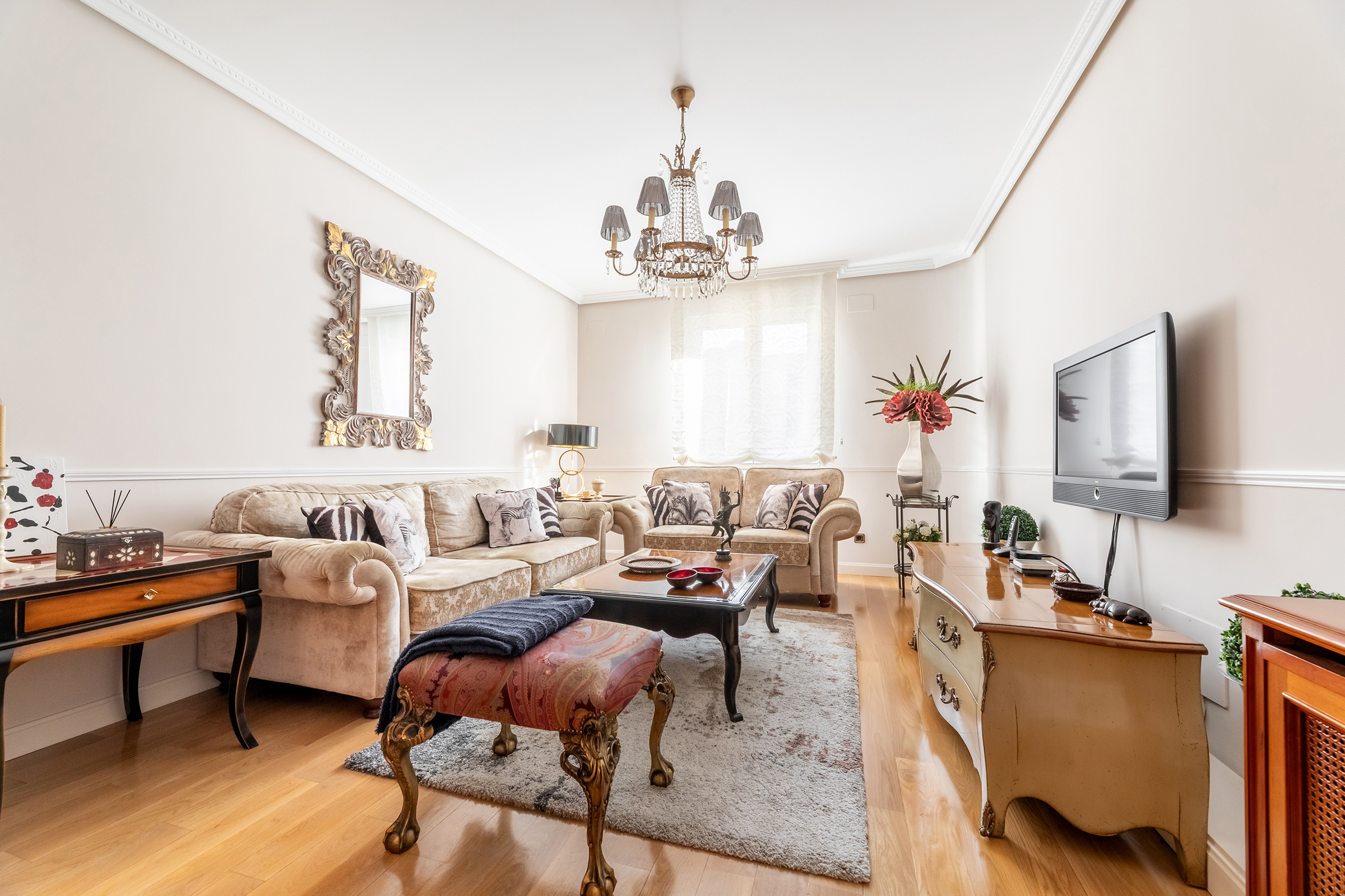 La vivienda se encuentra en pleno distrito de Salamanca, es exterior y está situada en una tercera planta. La zona de recibo consta de un gran comedor y un salón con unas vistas muy abiertas. La cocina es tan amplia que cuenta con una zona de trabajo –totalmente equipada- y un área de office en la que poder compartir tiempo en familia. Además, incluye un aseo de servicio.
